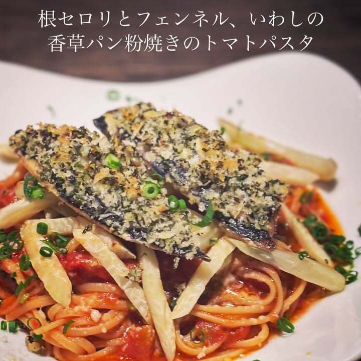 ル)を使ったトマトパスタに、脂の乗ったイワシの香草パン粉焼きをのせて。